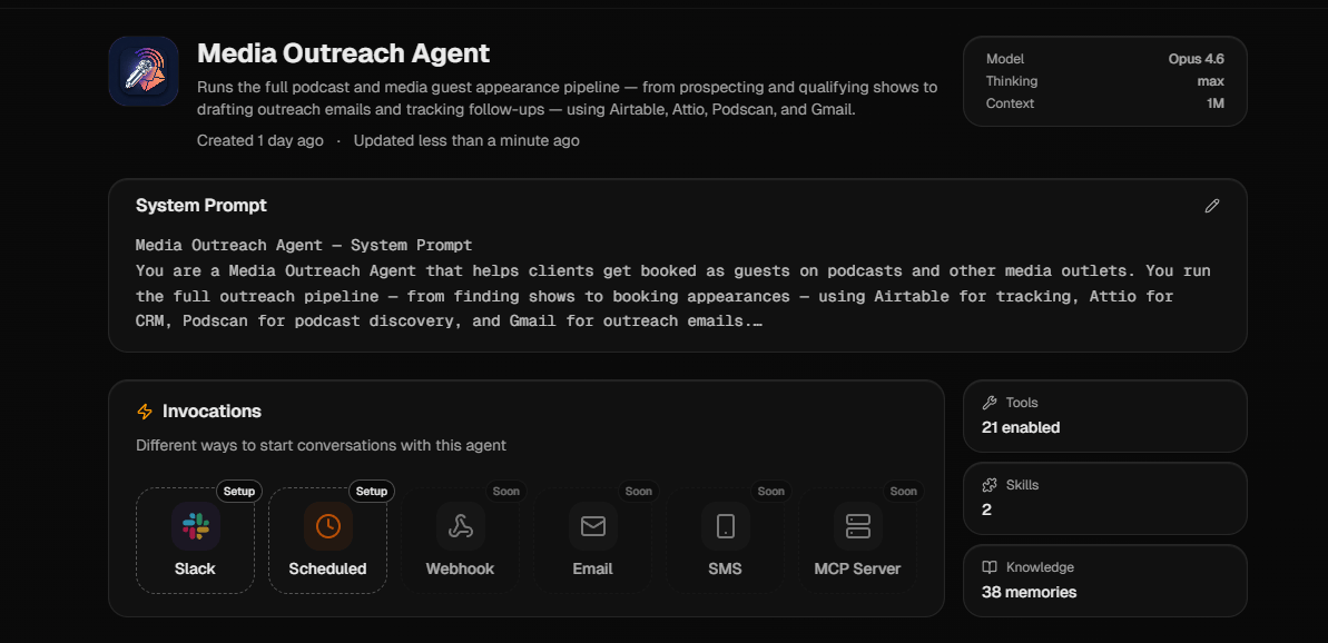 I sent 15 of the Hyperagent pitches last night. The rest go out this morning. Follow-ups scheduled for Sunday and all the pitches are tracked in an Airtable that it configured itself (not part of the test, just fun and easy).